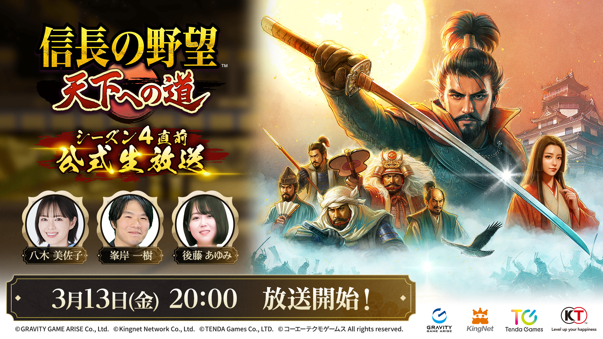 グラビティゲームアライズ株式会社(所在地:東京都中央区)は、スマートフォン向けMMO歴史戦略シミュレーションゲーム『信長の野望 天下への道』のシーズン4直前公式生放送をYouTube・Xにて 2026年3月13日(金) 20:00 より配信することをお知らせいたします。